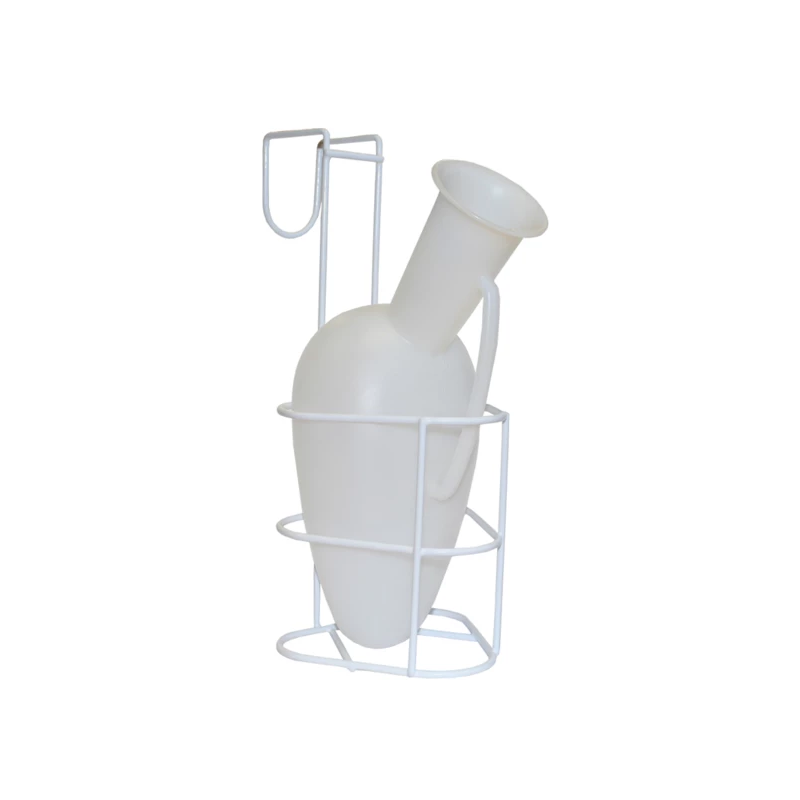 Une fois rempli et pour éviter d'avoir à poser l'urinal sur une table de lit, vous pouvez le glisser à l'intérieur du porte urinal. Le porte urinal est un support qui se positionne sur toutes les typologies de lit médicalisé. Le porte urinal peut également se glisser sur un lit standard. C'est un support métallique blanc et discret qui réceptionne l'urinal.