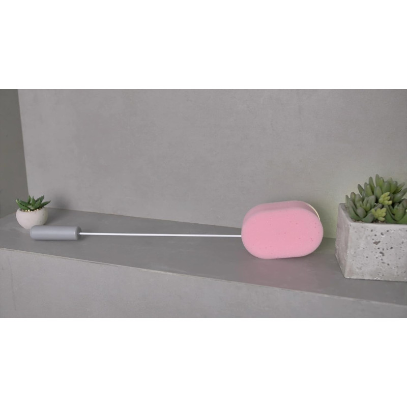 Le long manche est blanc et il est doté d'une poignée grise pour une prise en main facile de l'éponge lave dos.